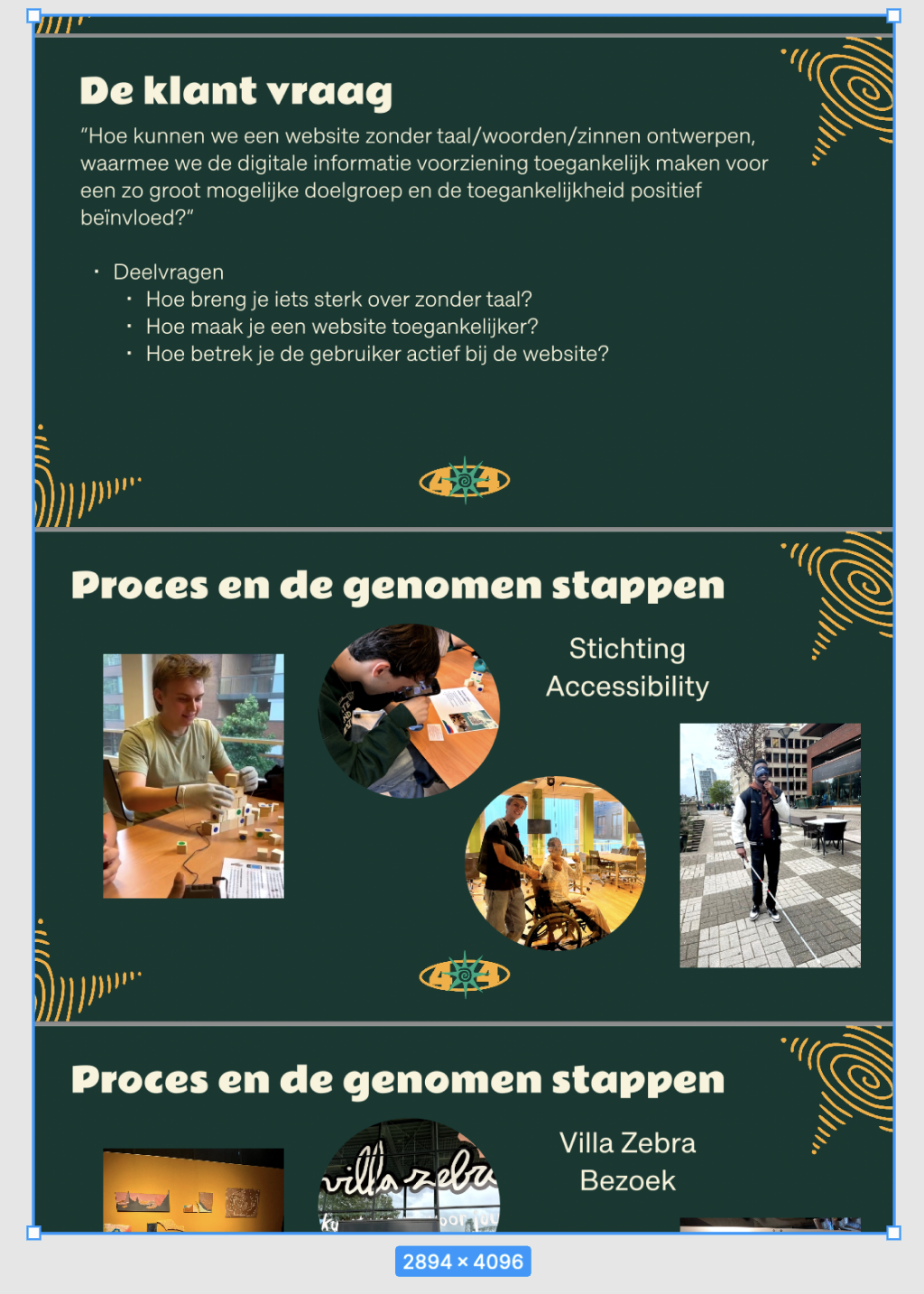 Na het doen van uitvoerig research hebben we alles geanalyseerd. Ik ben de overkoepelende factor geweest en heb alle inzichten doorgenomen en verbonden met elkaar. Wij hebben meerdere presentaties gegeven aan de opdrachtgever en zo gelijk feedback vergaard. Initieel werd er vanuit de opdrachtgever gevraagd om geen tekst te gebruiken op de website, maar nu we onze doelgroep leerde kennen hadden we door dat dit niet realistisch is voor hen en het hen alleen maar tegen zou werken. We zijn er dus voor gegaan om zo weinig mogelijk tekst te gebruiken en daarbij stelde ik ook de definitieve ontwerpvraag op die ons hielp focussen op het bouwen van een optimale oplossing.