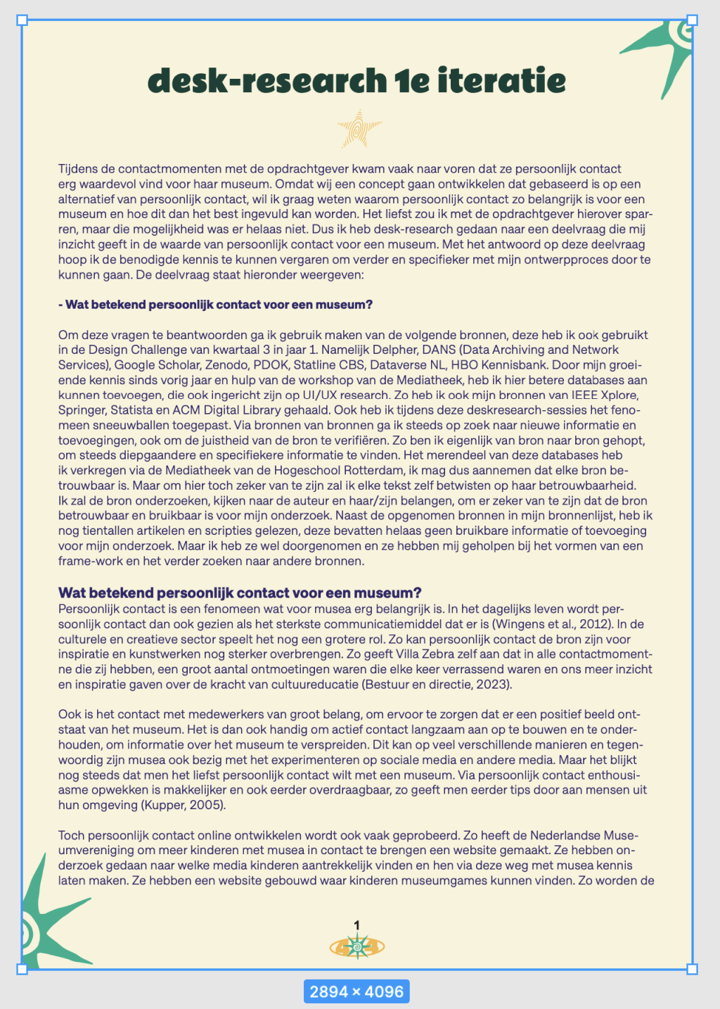 Tijdens dit project heb ik verschillende deliverables opgesteld en leren kennen. Zo heb ik elke presentatie opgemaakt en een onderzoeksposter ontworpen. Ook heb ik expo-posters gemaakt, desk-research gedaan en testrapportages opgesteld. Al ons onderzoek heb ik verwerkt in een onderzoeksrapportage.